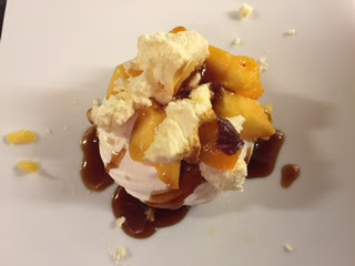 The recipe is very simple as I bought a shop-bought meringue due to lack of time. Slice up a fresh peach and drizzle over some honey; grill or roast them until softened and slightly browned. Pile on top of the meringue, top with whipped cream and drizzle with pomegranate molasses and pomegranate seeds as well if desired.