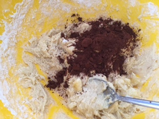 Separate the mixture into two bowls and add the cocoa powder to one bowl.